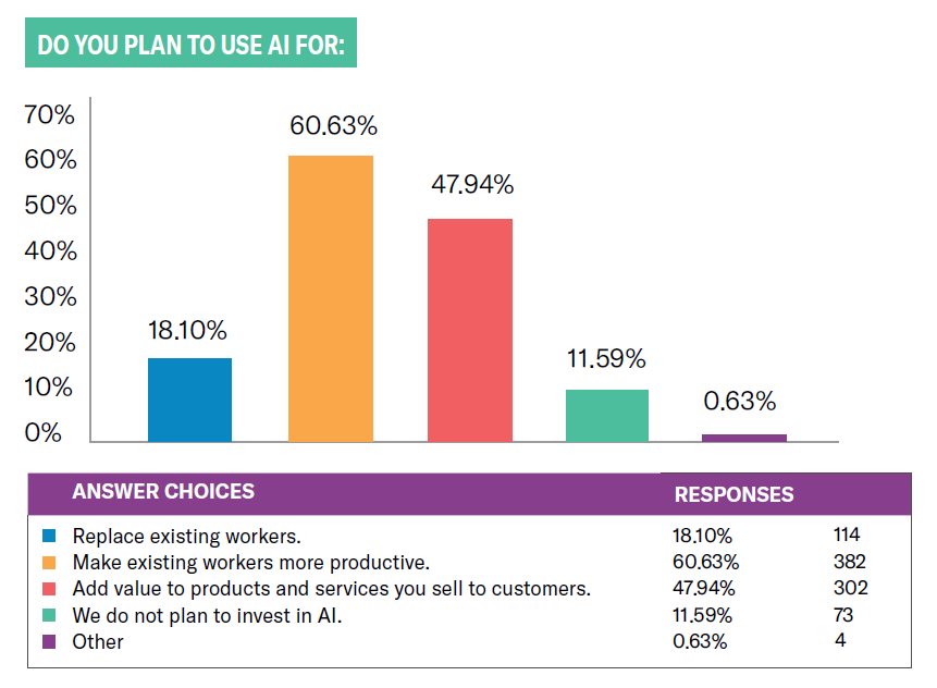 De façon plus instructive, le rapport n’évite pas le sujet critique des emplois. Il apparaît que « seulement » 18,1% des projets en cours visent à remplacer des postes tenus par des collaborateurs humains. Et d’une manière générale, 29,3% des responsables interrogés anticipent que l’intelligence artificielle conduira à une réduction des emplois dans leur industrie durant les dix prochaines années (toutefois seuls 10,6% pensent que cette réduction dépassera les 10% des effectifs). Pour 35,7% des responsables, le nombre des collaborateurs augmentera sur cette période. Ils sont 24,5% a estimé que le nombre de collaborateurs restera équivalent.