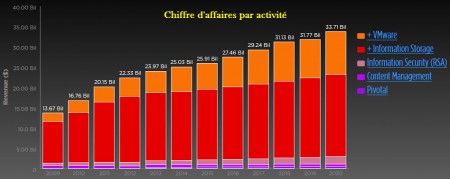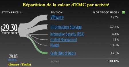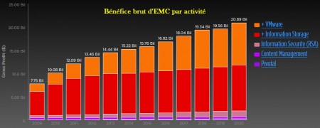 Selon re/code, HP serait principalement intéressé par l’acquisition de VMWare, le leader incontesté de la virtualisation. Il est vrai que si l’on regarde les chiffres, c’est l’activité la plus dynamique et financière intéressante d’EMC. Créé en 1998, VMWare a été racheté par EMC en 2004 tout en gardant un statut particulier. En 2007, EMC a introduit 15 % du capital sur le New York Stock Exchange. Entre 2009 et 2014, la part de VMWare dans le CA d’EMC est passée de 15 à 24 %. Côté profitabilité, la contribution de VMWare est encore plus importante à 34 % du bénéfice brut. De telle sorte que, selon le cabinet Trefis, VMWare représente 42 % de la capitalisation boursière de l’entreprise.