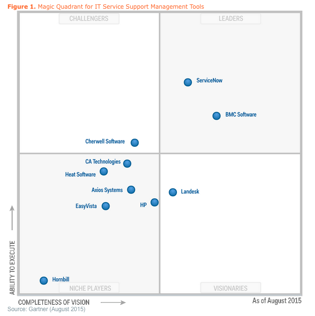 S’il existe plus d’une vingtaine d’outils d’ITSM, ( photo ci-dessus issue du magid Quadrant du Gartner) , de leur côté les produits de maintenance à distance couvrent des champs d’interventions assez différents mais qui recoupent aussi les fonctions de base. Mais ce type d’outils limité à la prise de controle à distance a fait ses preuves. La plupart des intégrateurs MSP sont fidèles à leurs fournisseurs, de même que les clients finaux qui mesurent la qualité de service à l’absence de pannes.