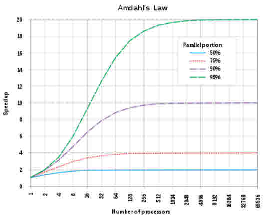 Elle énonce l’idée simple que l’accélération théorique est toujours limitée par la partie de la tâche qui ne peut tirer profit de l’amélioration (source Wikipedia). Par exemple, si un programme a besoin de 20 heures pour être exécuter sur un processeur uni-cœur et qu’une partie de ce programme peut être parallélisé, la loi définit la limite que l’on pourra atteindre quel que soit la proportion est parallélisée. Au-delà de la loi à proprement parlé, la parallélisation des tâches est très variable en fonction des applications.