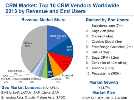 Salesforce, Sage et Oracle est le trio de tête du marché des applications de gestion de la relation client avec près de 40 % de parts cumulées. Ce marché connait une croissance comprise selon le Gartner entre 10 et 15 %.