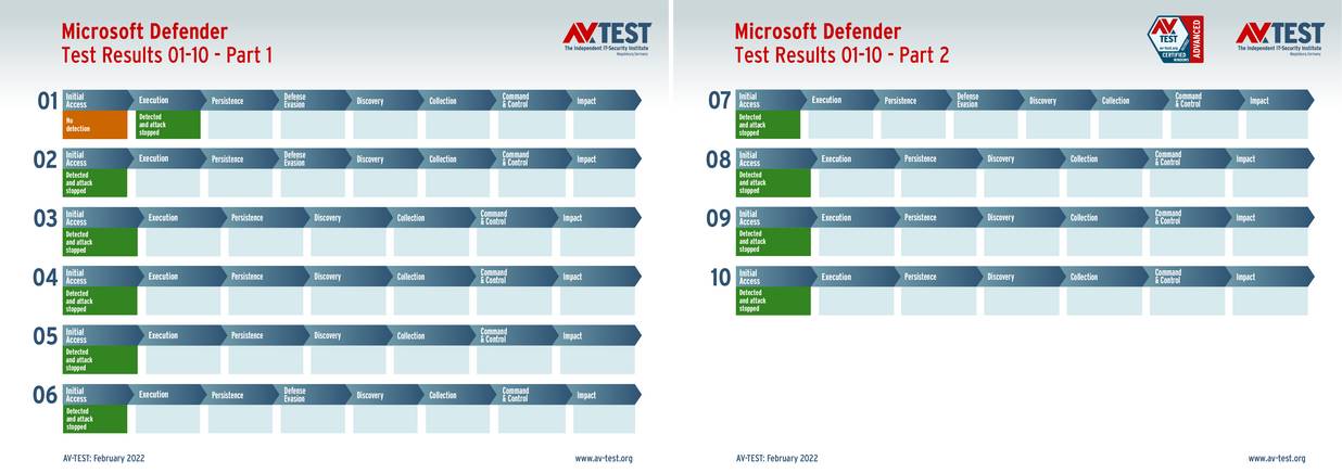 Comme 12 autres outils réputés du marché, Microsoft Defender obtient un score parfait de « 40/40 ». L’antivirus de Microsoft a bloqué les 9 des 10 attaques sophistiquées dès la toute première phase (phishing ou pièce attachée), la dixième ayant été stoppée lors de la tentative d’exécution de la menace.