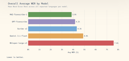 Côté performances, les chiffres parlent d’eux-mêmes : le modèle affiche un taux d’erreur mot (WER) moyen de 3,8 % sur le benchmark FLEURS, surpassant Whisper-large-v3 d’OpenAI sur les 25 langues testées, Gemini 3.1 Flash de Google sur 22 d’entre elles, et ElevenLabs Scribe v2 sur 15 langues. Sa vitesse de transcription en batch est 2,5 fois supérieure à l’offre Azure Fast existante de Microsoft. Et le tout avec moitié moins de GPU monopolisés que la concurrence.