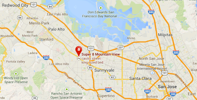 Pour recruter les meilleurs ingénieurs en informatique, mieux vaut s’installer à proximité de leurs universités comme Stanford ou mieux encore, en face de ses concurrents, afin de leur « piquer » les meilleurs éléments. Ce pourrait être le cas avec Microsoft qui veut renforcer sa présence à Mountain View dans son « Microsoft Corp Silicon Valley Research complex ». Mais la ville est désormais surtout connue pour son futur centre mondial Googleplex (image d’ouverture ci-dessus) qui est en train d’être construit dans les anciens locaux de la NASA face à la baie. Il y réunira ses 10 000 employés dont certains sont encore répartis actuellement dans de nombreux bureaux autour de San José. Après Facebook et son superbe bâtiment construit par Franck Guery à Menlo Park et le futur site de la soucoupe volante, celui du siège social d’Apple à Cupertino, Microsoft jouait plutôt la carte du provisoire avec des bâtiments loués depuis 15 ans. ( voir la carte ci dessous, « offerte » par le principal supermarché de literie de Mountain View, le Super 8, à deux pas de Google et de Microsoft. A gauche soit à l’est Palo Alto avec Google et au sud Cupertino avec Apple.)
