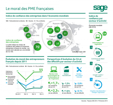 Si le moral des chefs d’entreprises français tous secteurs confondus n’est pas au plus haut niveau par rapport à d’autres pays, le secteur des technologies de l’information et de l’ingénierie voit tout de même des perspectives d’évolution du CA et des effectifs. Si l’on en croit l’infographie proposée par Sage.
