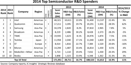 Ci-dessous selon les chiffres d’insight IC les dépenses et les achats de 2014. L’activité de Qualcomm (un fabricant qui sous traite ses composants- un » fabless ») et de ses concurrents montre que le marché des mobiles est en train de progresser et de se transformer à grande vitesse.