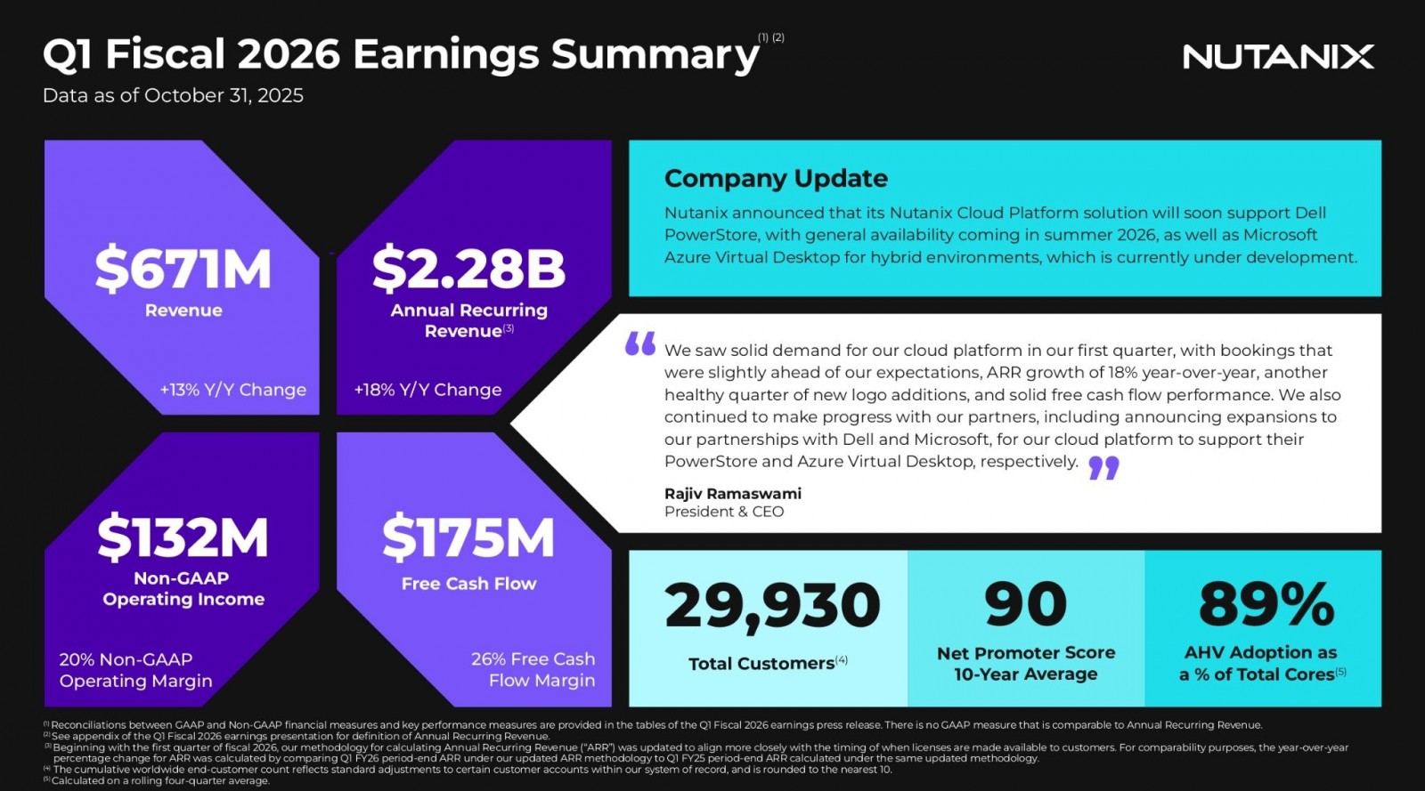L’exercice fiscal 2025, clos au 31 juillet dernier, avait marqué un tournant. Nutanix y affichait un chiffre d’affaires de 2,54 milliards de dollars, en hausse de 18 % sur un an, et un ARR (Annual Recurring Revenue) de 2,223 milliards, en progression de 17 %. Et surtout, l’entreprise décrochait au passage sa première année complète de résultat net GAAP positif, avec 188 millions de dollars de bénéfice, et un free cash-flow de 750 millions, soit une marge d’environ 30 %. Pour un éditeur qui avait toujours été déficitaire jusque-là, la combinaison d’une croissance à deux chiffres et d’une génération de cash élevée lui ouvrait des perspectives différentes. D’autant que Nutanix a aussi densifié son écosystème, en annonçant en 2025 des partenariats renforcés avec AWS, Pure Storage, NVIDIA et Google Cloud autour du cloud hybride et des workloads IA.