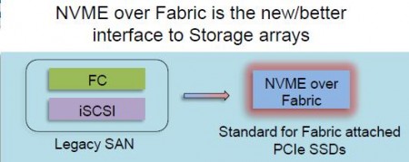Alors que NVMe en est train de remplacer les protocoles SAS et SATA, NVMEoF devrait constituer une évolution logique pour les protocoles Fiber Channel et iSCSI. NVMEoF supporte les protocoles Ethernet (il prend alors l’appellation RoCE) et Infiniband. L’arrivée de ce standard permet de résoudre l’écart de performance qui s’est agrandit entre les performances des processeurs et du stockage.