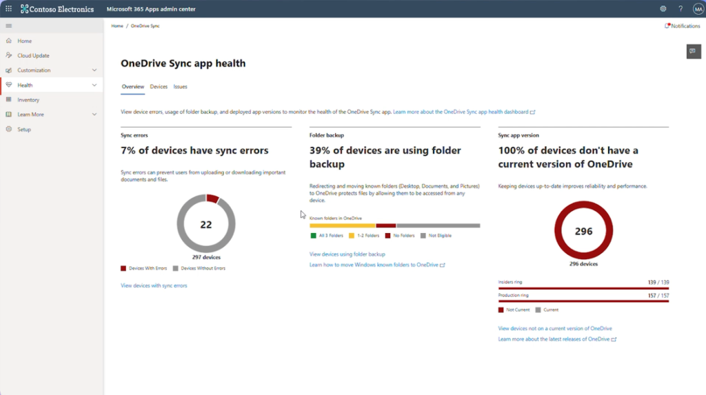 * Le troisième est un nouvel outil de supervision : Un Sync Health Dashboard vient enrichir le centre de contrôle « Microsoft 365 Apps Admin Center ». Il donne une vue agrégée de l’état de synchronisation OneDrive sur les postes, avec la possibilité d’exporter la télémétrie via Microsoft Graph Data Connect pour bâtir ses propres rapports/alertes (sous Power BI, Excel). Le dataset OneDrive Sync Health de Graph Data Connect recense notamment les appareils exécutant OneDrive Sync, les erreurs relevées, l’activation du “Known Folder Backup”, et la date de dernière activité, ce qui permet d’identifier les postes “hors-sync” ou en échec récurrent.