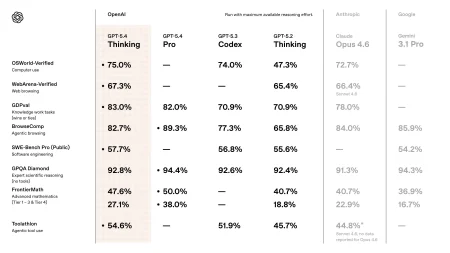 OpenAI décrit GPT-5.4 comme son « modèle frontière le plus performant et le plus efficient pour le travail professionnel ».