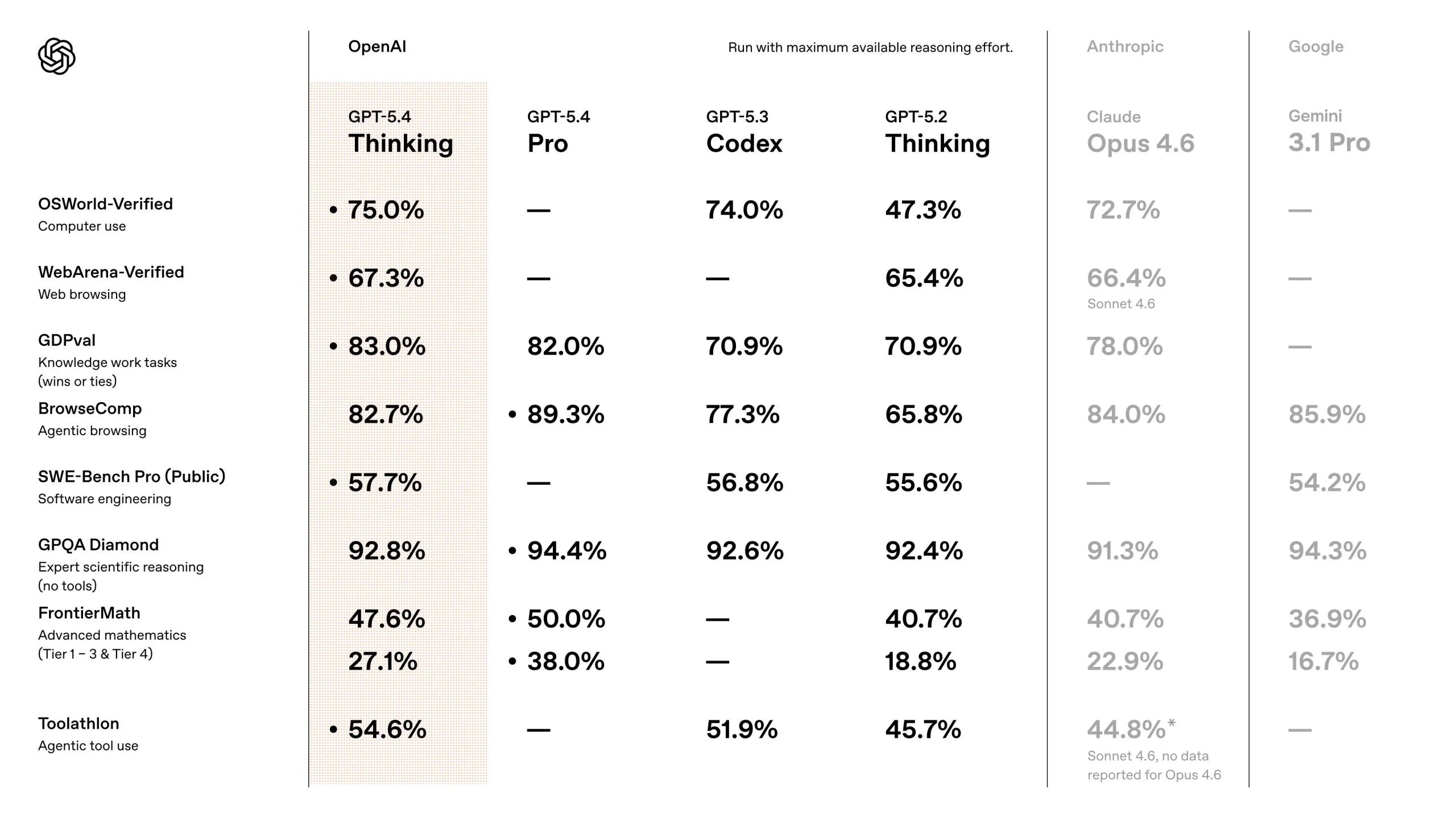 Au passage, OpenAI transforme à chaque itération un peu plus son assistant en plateforme d’agents professionnels capables de piloter des applications de bout en bout, pas seulement de répondre à des questions. Le computer use natif, la fenêtre de contexte d’un million de tokens et le ciblage explicite des métiers de la finance et de l’analyse positionnent « GPT-5.4 Thinking » en concurrent direct de Claude Code et Cowork (Anthropic) et de Gemini dans Google Workspace. On est donc très curieux de voir comment non seulement OpenAI mais aussi son partenaire Microsoft vont l’employer pour rendre Microsoft 365 et Windows 11 un peu plus intelligents et utiles.