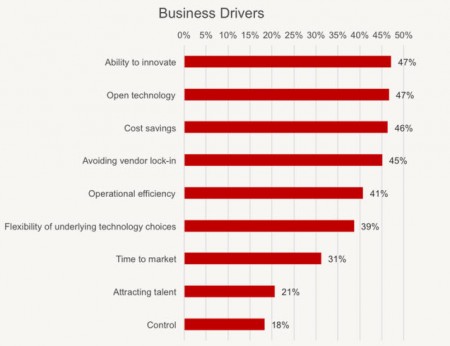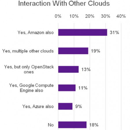 Les facteurs qui favorisent le choix d’OpenStack dans la mise en œuvre recouvrent à la fois ceux du cloud et de l’open source : innovation, ouverture, réduction des coûts, indépendance des fournisseurs sont les plus souvent cités. L’enquête donne aussi des enseignements intéressants sur d’autres éléments comme le type d’applications mises en œuvre ou d’hypeviseurs utilisés. Concernant ce dernier, c’est KVM qui arrive très largement en tête devant QEMU et NSX. Vient ensuite des configurations bare metal. L’interaction avec d’autres clouds est une situation qui est déjà assez répandue avec Amazon en tête devant d’autres infrastructures de clouds qui ne sont pas précisés. Le choix d’AWS n’est pas surprenant tant ce dernier domine actuellement le marché du cloud public (Services Cloud : Microsoft et IBM se rapprochent d’AWS).