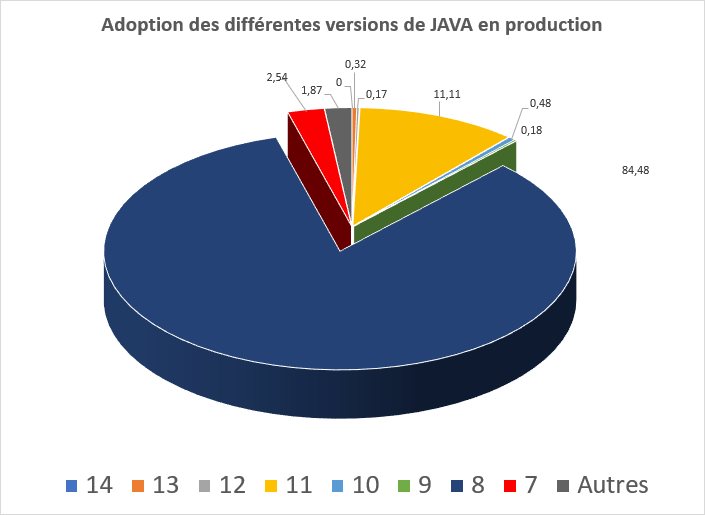 La dernière étude New Relic montre cependant que 85% des JVMs exécutées dans le monde tournent toujours sur Java 8, Java 11 devant se contenter d’un peu plus de 11% des implémentations. Autant dire que les versions modernes (12 et 13) sont bien peu exploitées. En l’occurrence, il y a moins de machines Java 12 et 13 combinées en opération que de machines Java 7 (version sortie en 2011 et dont le support classique s’est arrêté en 2015 avec un support étendu s’achevant en 2022).
