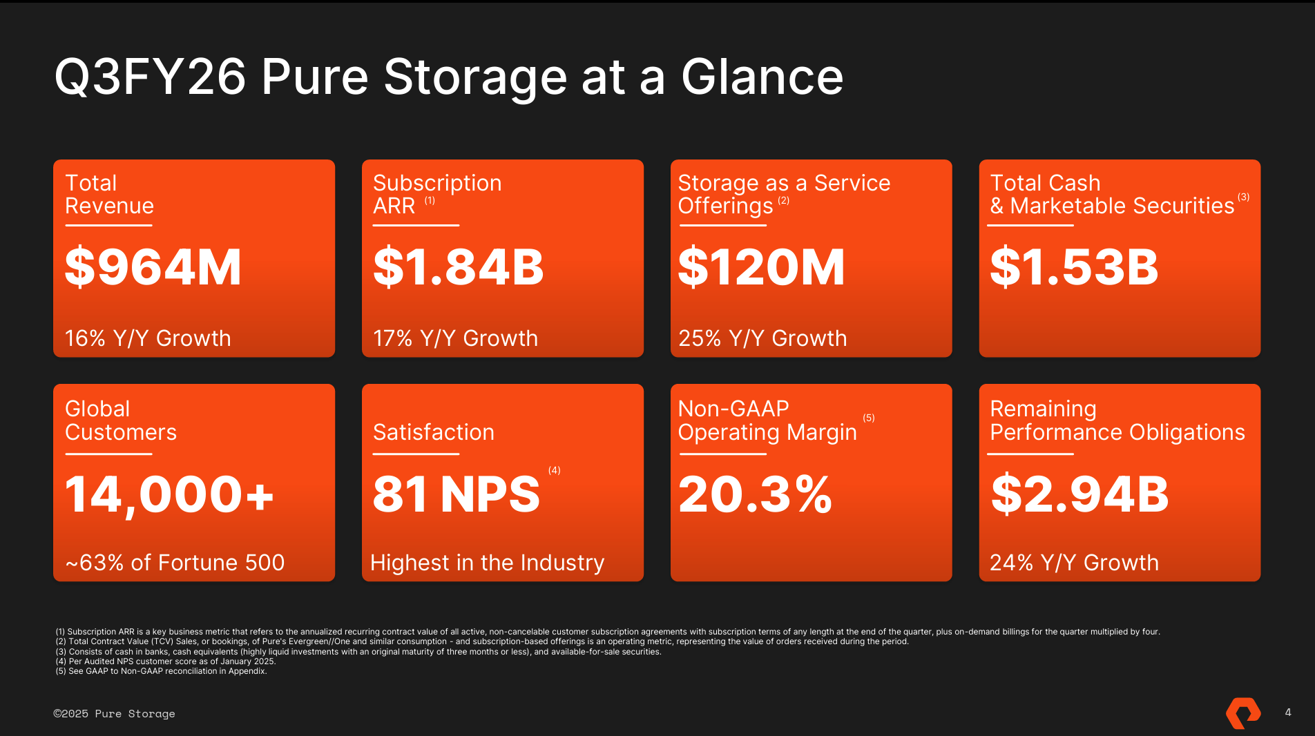 Le troisième trimestre fiscal 2026 confirme l’accélération. Pure Storage publie 964,5 millions de dollars de revenus, en progression de 16 % sur un an, au-dessus de sa propre guidance révisée du T2. Les services d’abonnement représentent 429,7 millions de dollars (+14 %), tandis que l’ARR franchit la barre des 1,8 milliard de dollars (+17 %) et que les RPO atteignent 2,9 milliards (+24 %).