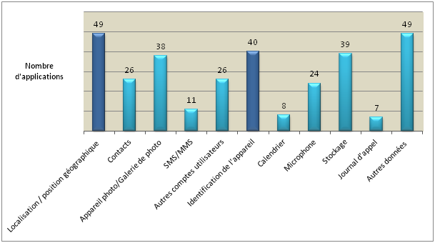 les données les plus collectées sont : la localisation, l’identifiant du terminal mobile, ainsi que les données d’accès à des comptes utilisateurs. Si pour certaines de ces données, leur collecte est justifiée par la finalité de l’application, pour d’autres cette collecte semble moins évidente.