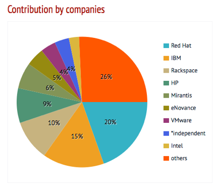 (ci dessous deux images crées en 2013 qui donnent une idée, sur les participation des différents éditeurs à openstack . Depuis a publications de ces schémas, Enovance a été racheté par Redhat Source: Stackalytics.com et Mirantis)