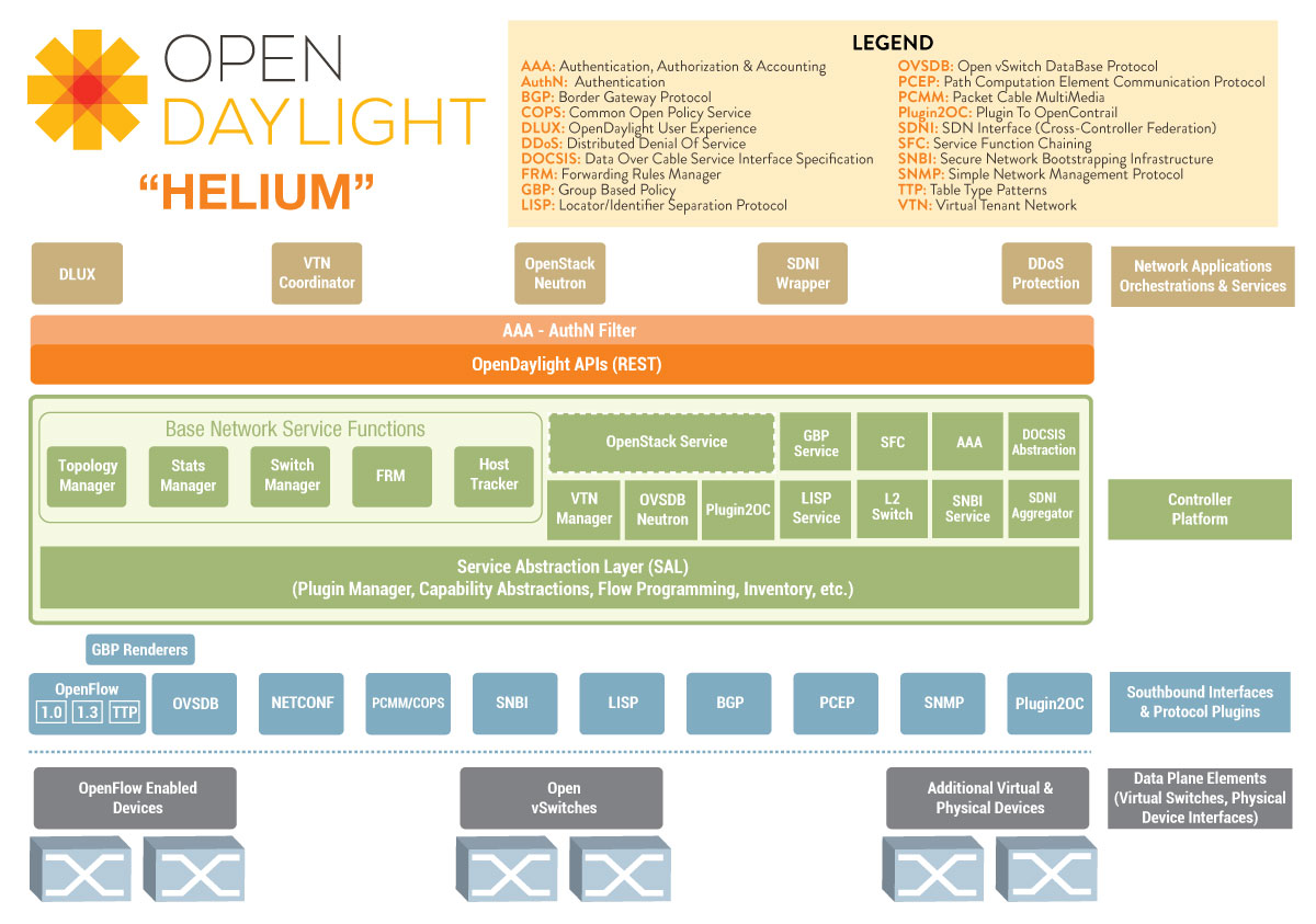 OpenDaylight hélium comprend également un projet de contrôle d’accès appelé AAA (Access, authorisation et accounting (comptabilité)) dont l’objectif est de renforcer davantage la sécurité de l’utilisateur SDN. L’autre idée directrice est le contrôleur de fédération. Ce dernier point se manifeste dans OpenDaylight hélium avec le SDNi projet (Software Defined d’interface réseau). On peut s’attendre à une avalanche de nouveaux produits intégrant ces nouvelles fonctionnalités.