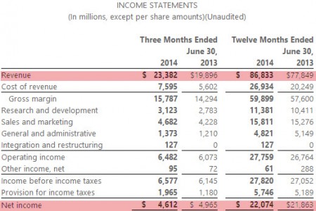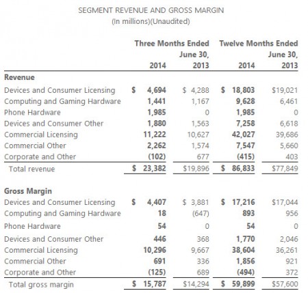 Avec 88,8 mds $ de chiffre d’affaires en progression de 12% par rapport à l’exercice fiscal 2013 et 22 mds$ de bénéfice net en quasi-stagnation, Microsoft agrandi de Nokia, réalise un exercice fiscal 2014 satisfaisant.