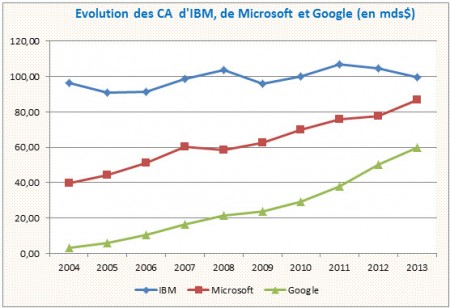 Encore deux ou trois ans et Microsoft dépassera IBM en termes de chiffre d’affaires. Mais voilà déjà plusieurs années que la firme de Seattle a largement surpassé Big Blue en profitabilité. Mais à cette échéance, Google aura peut-êtredépassé à la fois Microsoft et IBM. Ainsi va le monde de l’IT et des technologies avec orbites différentes de croissance.