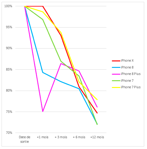 Évolution moyenne des prix sur les versions précédentes 7, 7 Plus, 8, 8 Plus et X