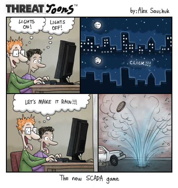 Désormais complètement informatisés, les outils des sites industriels sont chargés de contrôler – le fonctionnement ininterrompu – des procédés technologiques dans pratiquement tous les secteurs de l’industrie, qu’il s’agisse de l’industrie électrique, des transports, des chaînes de production, etc. Même les immeubles de bureaux modernes sont informatisés pour être administrés à distances (ascenseurs, électricité, distribution de l’eau, systèmes d’alarmes incendies, air conditionné, etc.). Ci-dessous une vision simplificatrice mais suggestive du dessinateur Alex Savchuk sur le site financé par Général Electric : http://www.threatgeek.com