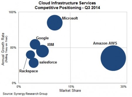 Amazon reste le maître incontesté des services cloud mais les fournisseurs qui sont à sa suite sont en train de le rattraper, notamment Microsoft, au terme d’une croissance rapide au troisième trimestre 2014. C’est ce qu’indique le cabinet Synergy Research Group dans son bilan trimestriel des principaux acteurs du cloud. AWS reste donc le leader avec près de 30 % devant Microsoft qui approche les 15 % et IBM crédité par le cabinet de 7 %. Viennent ensuite Google, Salesforce et Rackspace.