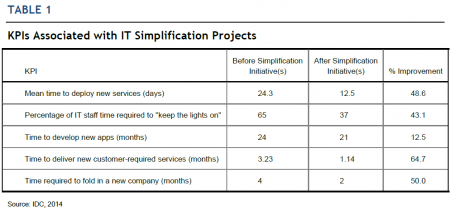 Pour cette étude, IDC a défini des indicateurs des indicateurs clés de performance (KPI) et montre ainsi les améliorations chiffrées (voir tableau ci-dessous) que peuvent apporter des initiatives de simplification dans différents domaines : déploiement de nouveaux services ou nouvelles applications, pourcentage de la DSI nécessaire au fonctionnement de l’IT…