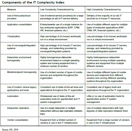 IDC définit la complexité comme un « état de l’infrastructure IT qui conduit à gaspiller inutilement des ressources, du temps ou des moyens financiers ». Cette situation peut être causée par la présence d’environnements hétérogènes, l’utilisation de technologies obsolètes, la multiplication et dissémination des serveurs et des applications, le manque d’utilisation des outils d’administration et d’automatisation, l’existence des poches informatiques décentralisées et utilisées par différentes parties de l’organisation.