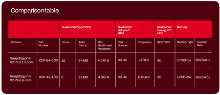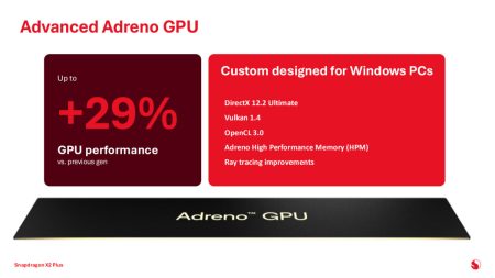 Au passage, Qualcomm améliore considérablement ce qui était la grosse faiblesse de sa première génération, le GPU intégré. Les processeurs « X2 Plus » se voient dotés d’un nouveau iGPU Adreno « X2-45 » qui propose entre 29% et 39% de performance en plus que la première génération et peut piloter jusqu’à 3 écrans 4K via des ports USB 4.0.