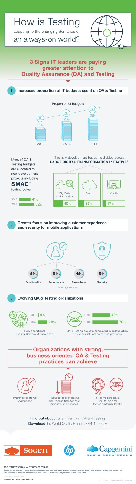 C’est ce qu’indique l’édition 2014 du World Quality Report réalisée auprès de plus de 1500 DSI et responsables qualité qui confirme que les tests et l’assurance qualité sont désormais reconnus comme une fonction essentielle par les entreprises car il est de plus en plus important d’assurer la qualité de leurs applications et de réduire la complexité informatique liée aux réseaux sociaux, à la mobilité, à l’analytique, au Cloud, ainsi qu’à l’Internet des objets.