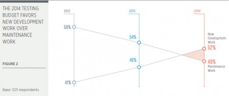 Parmi les tendances mises en évidence, le rapport de Capgemini point sur une diminution de l’offshore qui passe de 28 % en 2013 à 21 % en 2014. Un des facteurs qui l’explique est la nécessité de la collaboration entre les équipes de tests et les différentes fonctions de l’entreprise. Les projets de transformation numérique consomment une part importante des budgets de tests.
