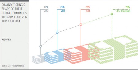 De manière générale, face à l’impact potentiel des commentaires publiés sur les réseaux sociaux et sur Internet, les entreprises se préoccupent de plus en plus des répercussions sur leur réputation et sur leur capital marque que peuvent entrainer les dysfonctionnements de leurs applications. Les dépenses moyennes consacrées à l’assurance qualité sont passées de 18% du budget informatique global en 2012, à 23% en 2013 et à 26% en 2014. La part des budgets consacrée aux tests logiciels devrait continuer à augmenter au cours des prochaines années et représenter 29% en 2017. Cette augmentation des budgets alloués aux tests se vérifie dans tous les secteurs mais touche particulièrement dans la high tech, l’énergie et les utilities et les transports.