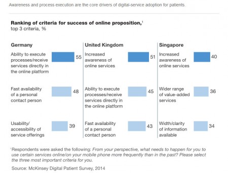 Mais estiment Stefan Biesdorf et Florian Niedermann, consultatnts du cabinet McKinsey dans une notre intitulée Healthcare’s digital future, cette troisième s’avère plus complexe que les deux précédentes, en partie parce qu’elle se différencie sur un point essentiel : elle concerne directement le patient et ses attentes, là où les deux premières phases visaient principalement l’automatisation des processus. Et ensuite parce qu’elle nécessite de trouver les moyens les plus adaptés pour y répondre. Pour que cette troisième phase réussisse, il est impératif que le patient soit devenu un utilisateur averti des différentes technologies qui sont désormais à disposition. Et de ce point de vue les succès des sites spécialisés en médecine tels que Doctissimo, DrEd, PatientsLikeMe ou ZocDoc démontrent aisément l’intérêt porté par le grand public pour accéder aux informations de santé. A tel point même que la relation patient/médecin en est transformée peu à peu. Avant d’aller consulter son médecin, le patient d’informe sur différents sites et forums.