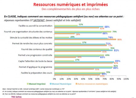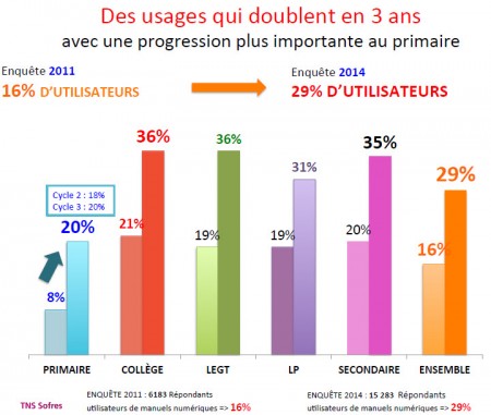 Bien que connaissant la plus forte progression des usages (20% des enseignants utilisent un manuel numérique en 2014 alors qu’ils n’étaient que 8% en 2011) le primaire en reste encore le parent pauvre, principalement pour des raisons d’équipement et de crédits d’acquisition des ressources, jugés insuffisants par 70% des enseignants, tous niveaux confondus. C’est ce qu’indique une enquête réalisée par l’institut TNS-Sofres auprès de plus de 15 000 enseignants pour le comte des éditeurs de livres scolaires. Cependant, les usages individuels des élèves se situent encore à des niveaux très faibles (7%).