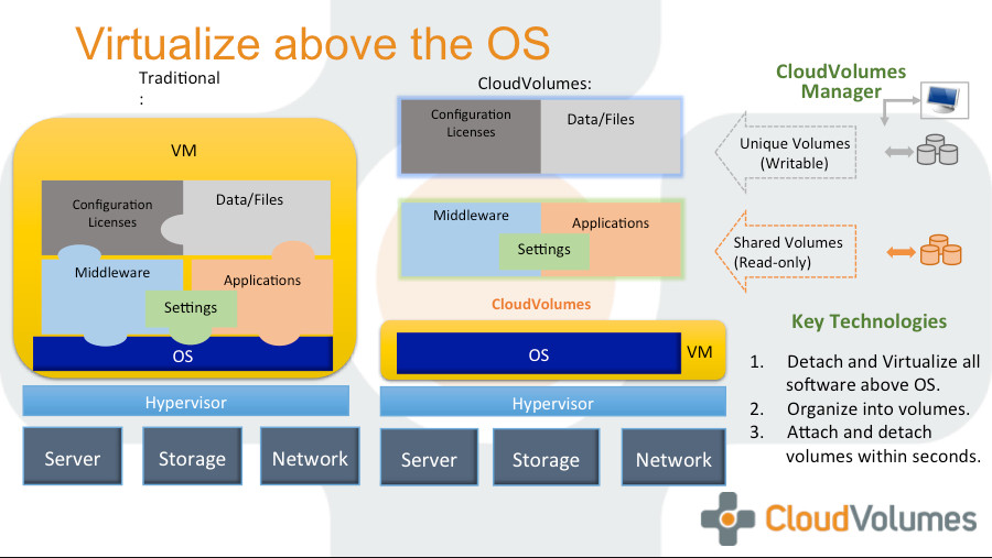 Mais, fin août, Vmware s’est offert un autre éditeur, CloudVolumes, qui va encore plus loin dans la virtualisation. Son programme permet le clonage « à chaud » des configurations existantes et un déploiement ultra rapide des applications. Ainsi, tous les fichiers, données et applications utilisés par plus d’une machine virtuelle pourront être hébergés sur d’autres volumes virtuels. L’objectif est toujours de faciliter la gestion centralisée d’applications disponibles, aussi bien sur un poste de travail, un serveur que dans le cloud. Précisément, CloudVolumes divise les éléments nécessaires pour déployer une application en plusieurs blocs distincts, les buckets (des seaux, sorte de conteneurs d’application). Dans un premier conteneur, on va trouver le middleware, les applications et leurs paramètres; et dans un second les licences de configuration, les données et les fichiers. Le programme garde bien évidemment, par ailleurs, une trace précise de l’emplacement des différents modules et de leurs interactions passées.